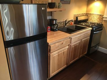 The kitchen has all you need to prepare and serve your own meals; a gas range and oven, microwave, toaster, and coffee maker - complete with coffee, tea, creamer, and sweeteners provided. Pots and pan, dishes, silverware, cooking utinsels, and basic cooking supplies are provided.